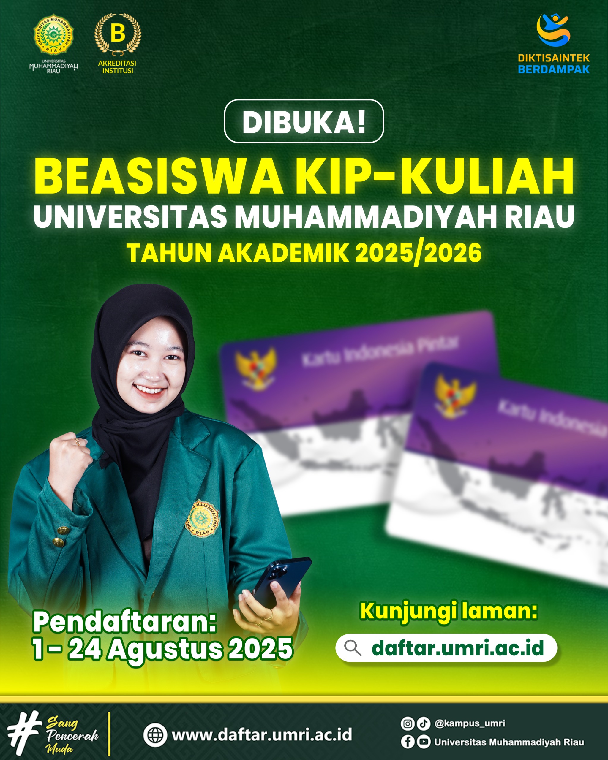Bersama dengan ini kami lampirkan pengumuman tentang Pembukaan Penerimaan Mahasiswa Baru Jalur Beasiswa Kartu Indonesia Pintar Kuliah (KIP-K) di Universitas Muhammadiyah Riau Tahun Akademik 2025/2026. Silahkan unduh pengumumannya disini.